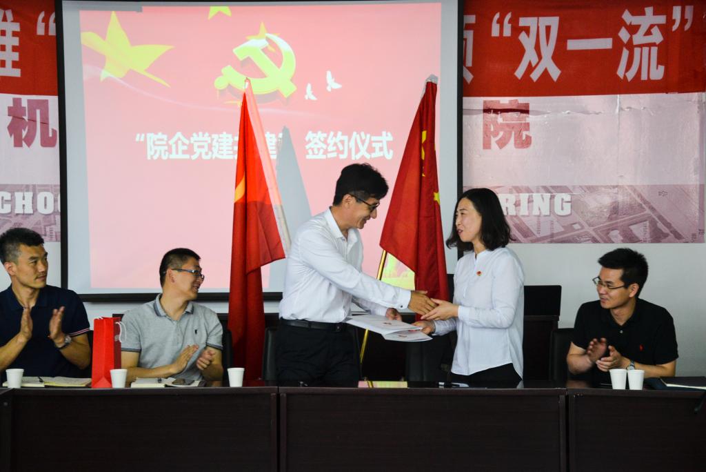 为进一步学习贯彻习近平新时代中国特色社会主义思想和党的十九大精神,全面推进党组织建设,创新党建工作载体,搭建党建共建平台,加快迈进“双一流”进程,服务辽宁新一轮全面振兴, 5月22日,公司党委联合沈阳机床集团优装备i5T系列党总支共同开展“院企共推‘产学研’,党建引领‘双一流’”主题党日活动。双方共同举行了院企党建共建协议签约仪式。沈阳机床集团优装备i5T系列党总支书记盖立亚、沈阳机床集团优装备i5T1党支部书记刘志强、沈阳机床集团优装备i5T3党支部书记李士博、公司党委书记曲弋、公司党委副书记孙健出席活动。伟德国际1946源于英国组织员、党支部书记、教师和员工党员代表参加了本次活动。